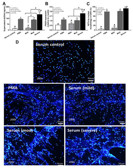 Neutrophil extracellular traps (NETs) of the isolated neutrophils from healthy volunteers after activation by control serum and serum from cases with different COVID-19 severities, using Phorbol 12-myristate 13-acetate (PMA) as a positive control of NETs inducers, as indicated by supernatant dsDNA (A), Peptidyl Arginine Deiminase 4 (PAD-4) expression (B), and morphology of DAPI nuclear staining with the representative pictures (C,D) (the cells from 7 volunteers were used in all activations). * p < 0.05 vs internal serum control groups, Φ p < 0.05 between the indicated groups and # p < 0.05 vs PMAas determined by ANOVA with Tukey’s analysis.
