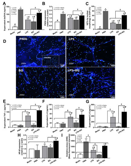 Neutrophil extracellular traps (NETs) of the isolated neutrophils from healthy volunteers after activation by control serum, lipopolysaccharide (LPS) with and without (1→3)-β-D-glucan (BG), using Phorbol 12-myristate 13-acetate (PMA) as a positive control of NETs inducers, as indicated by supernatant dsDNA (A), Peptidyl Arginine Deiminase 4 (PAD-4) expression (B), morphology of DAPI nuclear staining with the representative pictures (C,D), supernatant cytokines (E–G), nuclear factor kappa B (NFκB) expression (H), and reactive oxygen species (ROS) using dihydroethidium (DHE) (I) (neutrophils were isolated from 7 volunteers and each groups of neutrophils were used in all group of activations). * p < 0.05 vs internal serum control groups, Φ p < 0.05 between the indicated groups and # p < 0.05 vs PMAas determined by ANOVA with Tukey’s analysis.