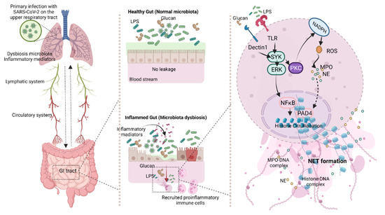 The working hypothesis proposes a mechanism of gut barrier defect and neutrophil extracellular traps (NETs) in SARS-CoV-2 infection that originates from the lung before infecting other ACE-2 positive cells, including enterocytes. Cytokine storm and enterocyte damage enable the gut translocation of pathogen molecules, lipopolysaccharide (LPS), and (1→3)-β-D-glucan (BG), that possibly enhance neutrophil responses through TLR-4 and Dectin-1, respectively, with downstream signaling, spleen tyrosine kinase (SYK), extracellular-signal-regulated kinases (ERK), protein kinase C (PKC), nuclear factor kappa B (NFκB), and nicotinamide adenine dinucleotide phosphate (NADH). These mediators finally activate NETs-associated molecules, peptidylarginine deiminase 4 (PAD-4), myeloperoxidase (MPO), and neutrophil elastase (NE). Gut barrier defect, cytokine storm, and neutrophilia in COVID-19 infection elevate systemic inflammatory responses and sepsis severity. ROS—reactive oxygen species.