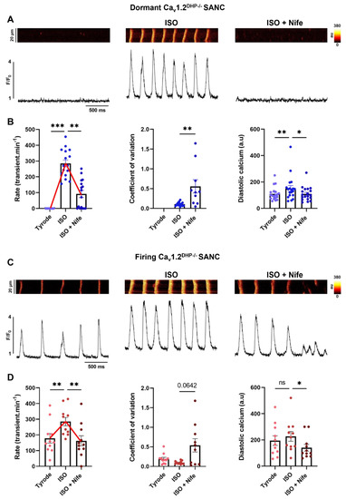 3.4. β-Adrenergic Activation of SANC Automaticity Synchronizes LCRs in Late Diastole and Is Dependent of L-Type Cav1.3 Ca2+ Channels