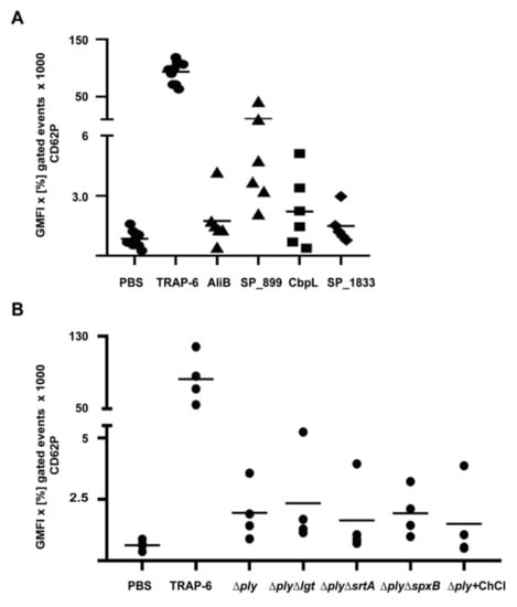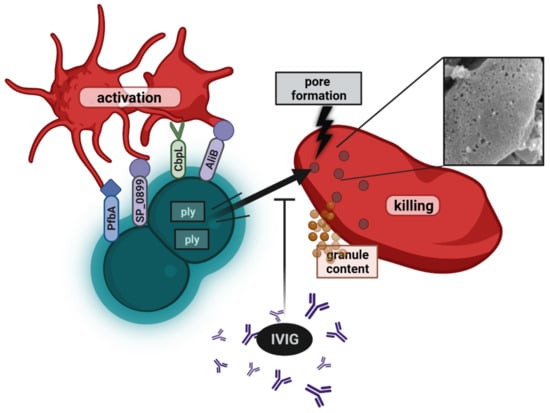 - Jahn, K.; Handtke, S.; Palankar, R.; Weißmüller, S.; Nouailles, G.; Kohler, T.P.; Wesche, J.; Rohde, M.; Heinz, C.; Aschenbrenner, A.F.; et al. Pneumolysin induces platelet destruction, not platelet activation, which can be prevented by immunoglobulin preparations in vitro. Blood Adv. 2020, 4, 6315–6326. [Google Scholar] [CrossRef]