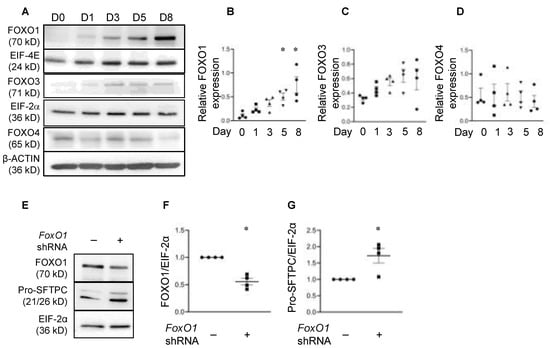FOXO1 increases in alveolar epithelial cells as a function of time in culture, and knockdown increases expression of the AT2 cell-specific marker SFTPC. Representative Western blot (WB) (A) and quantitation (B–D) show that the expression of FOXO1, but not FOXO3 and FOXO4, increases as rat AT2 cells (D0) differentiate into AT1-like cells at day eight (D8) in primary culture. EIF-4E, EIF-2α, and β-ACTIN were the loading controls. n = 4 for each group. One-way ANOVA, asterisk indicates p < 0.05 compared to D0. Representative WB (E) and quantitation (F,G) show that knockdown of FOXO1 increased pro-SFTPC expression in primary AEC six days following transduction with FoxO1 shRNA (+) or non-silencing shRNA (−) on Day two. EIF-2α was used as the loading control. The data were normalized to non-silencing shRNA. n = 4 for each group. Unpaired two-tailed t-test, asterisk indicates p < 0.05.
