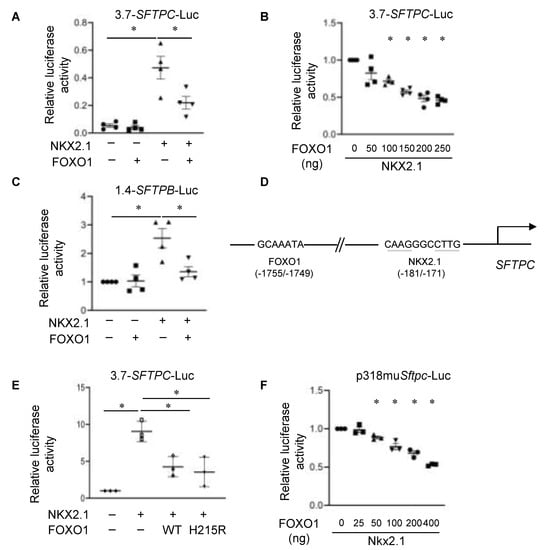 3.2. FOXO1 Inhibits NKX2.1-Induced Human SFTPC Promoter Activity