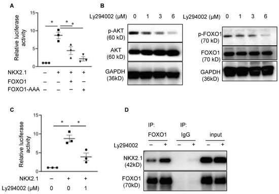 We next sought to investigate the mechanisms that could regulate FOXO1 interactions with NKX2.1. FOXO1 nuclear translocation and activity are regulated by phosphorylation/dephosphorylation, with unphosphorylated FOXO1 being nuclear and active while phosphorylated FOXO1 is cytoplasmic and becomes degraded by the ubiquitination proteosome pathway [74]. To investigate whether FOXO1 phosphorylation/dephosphorylation regulates its effects on NKX2.1-mediated SFTPC activation, MLE-15 cells were transfected with the SFTPC promoter reporter 3.7-SFTPC-Luc, pRC/CMV/NKX2.1, as well as either pCDNA3 FOXO1 or a constitutively active form of FOXO1 (pCDNA3 FOXO1-AAA). Compared to the wild-type FOXO1, co-transfection with the FOXO1-AAA mutant showed a trend toward further inhibiting NKX2.1-mediated transactivation of the SFTPC promoter (Figure 4A) suggesting FOXO1 phosphorylation decreases its inhibitory effects on NKX2.1-mediated activation of SFTPC. The addition of the PI-3K/AKT inhibitor Ly294002 to co-transfections in the MLE15 cells with the 3.7-kb human SFTPC promoter and NKX2.1 expression plasmid decreased p-FOXO1 and p-AKT levels and attenuated NKX2.1-mediated transactivation of the SFTPC promoter activity by ~60% (Figure 4B,C), further supporting that non-phosphorylated FOXO1 is necessary for NKX2.1-mediated loss of surfactant gene activation. To determine whether FOXO1 phosphorylation affects its binding to NKX2.1, co-IP was performed using nuclear extracts that were harvested from MLE-15 cells that were treated with Ly294002 (6 μM) for 48 h. Ly294002 treatment increased the association between FOXO1 and NKX2.1 (Figure 4D) suggesting that PI-3K/AKT negatively regulates the association between FOXO1 and NKX2.1.