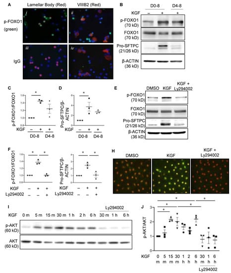 Given that FOXO1 interaction with NKX2.1 disrupts NKX2.1-activated SFTPC expression and that phosphorylation alters the interaction of FOXO1 and NKX2.1, we examined the dynamic changes in FOXO1 phosphorylation/dephosphorylation in the context of rat AEC differentiation. We performed co-immunostaining of freshly isolated rat AEC (containing both AT2 and AT1 cells) with anti-phosphorylated FOXO1 (p-FOXO1)/anti-P180 (an AT2 cell-specific marker), or with anti-p-FOXO1/antiVIIIB2 (an AT1 cell-specific marker) antibodies. p-FOXO1 colocalized with lamellar body protein but not with VIIIB2 (Figure 5A). Together with Figure 1A, these results suggest that the phosphorylated form of FOXO1 predominates in AT2 cells, and that unphosphorylated FOXO1 is the predominant form that is found in AT1 cells. We previously reported that treatment of AEC in vitro with KGF maintains the AT2 cell-like phenotype [6]. Consistent with the notion that FOXO1 is phosphorylated in AT2 cells, KGF treatment from D0 to D8 increased p-FOXO1 and the expression of the AT2 cell marker pro-SFTPC. A similar trend was observed with KGF treatment of AT1.5 intermediate cells (D4) through D8 of AEC differentiation (Figure 5B–D). We next examined whether phosphorylation of FOXO1 was regulated by the PI-3K/AKT pathway during AEC differentiation. The treatment of AEC with the PI-3K/AKT inhibitor Ly294002 from D4–D8 decreased KGF-induced p-FOXO1 and pro-SFTPC expression (Figure 5E–H). Furthermore, the treatment of primary rat AEC with KGF resulted in an increase in phosphorylated AKT within 15 min which was sustained up to 6 h, while the treatment of the cells with Ly294002 markedly reduced p-AKT levels (Figure 5I,J). These data suggest that KGF plays an important role in regulating AT2 cell-specific SFTPC expression and maintaining AT2 cell phenotype via PI-3K/AKT-dependent phosphorylation of FOXO1.