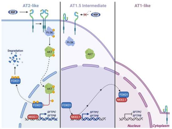 Model of mechanisms underlying FOXO1 regulation of lung-specific NKX2.1-activated genes via PI-3K/AKT-dependent phosphorylation. In AT2 and AT2-like cells in the presence of KGF, the PI-3K/AKT pathway is activated, leading to downstream phosphorylation of FOXO1 and subsequent cytoplasmic extrusion and degradation. The absence of nuclear FOXO1 allows active NKX2.1 to remain at the SFTPC and SFTPB promoters, increasing the expression of these AT2 cell-specific target genes. During the transition from AT2 to AT1-like cells (AT1.5 intermediate cells), or in the absence of KGF, the PI-3K/AKT pathway becomes inactivated. This in turn prevents the phosphorylation of FOXO1, allowing it to remain in the nucleus and interact with and pull NKX2.1 from its target promoters. This process is completed in differentiated AT1-like cells, where NKX2.1 removal from target genes by FOXO1 leads to the inhibition of gene expression. The figure was created with BioRender (BioRender Academic License https://biorender.com/ (accessed on 14 March 2022)).