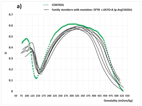 Blood samples were collected in EDTA-K3 anticoagulant after obtaining informed consent and approval from the Institutional Ethical Committee. All the diagnostic procedures and investigations were performed in accordance with the Helsinki Declaration of 1975. Studies were carried out via a stepwise process, including basic and hemolysis laboratory tests according to Vives Corrons and Aguilar Bascompte [23], RBC enzyme activities were measured by Beutler’s procedure [24], and eosin-5-maleimide (EMA) binding test, as described by King et al. [25] and revisited by King and Zanella [26]. RBC deformability and other rheological parameters were analyzed by osmotic gradient ektacytometry (OGE), using the osmoscan module of the Laser-assisted Optical Rotational Deformability Cell Analyser LoRRca (MaxSis. RR Mechatronics), as previously described [4,5] The parameters used for the OGE evaluation were (1) EImax (maximum elongation index) or the maximal value of RBC deformability; (2) Omin (osmotic value where EI is minimal), which represents the conventional RBC osmotic fragility (OF); (3) Ohyper (osmotic value corresponding to 50% of the EImax), which reflects the cellular hydration status; and (4) AUC (Area under the curve), which reflects RBC deformability in the whole gradient osmolality profile. Genetic identification of SPTB and PKLR mutations was performed by SGene capture, followed by t-NGS, as previously described [4,5].
