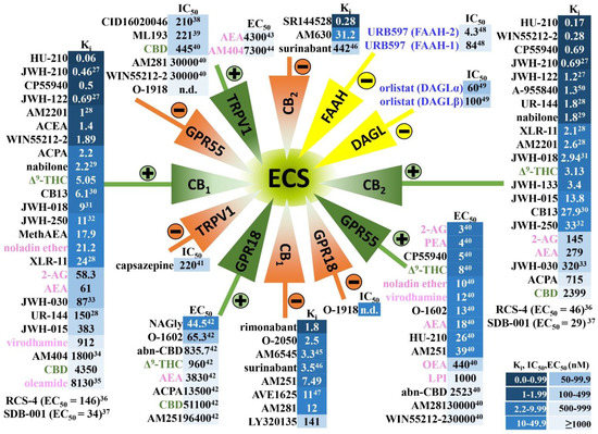 Figure 1. Cannabinoids and their affinities to the classical cannabinoid CB1 and CB2 receptors and to other receptors sensitive to cannabinoids, as well as to inhibitors of enzymes involved in the synthesis and/or degradation of AEA and 2-AG. Note that the numbers in the superscript indicate the appropriate reference [15,16,17,18,19,20,21,22,23,24,25,26,27,28,29,30,31,32,33,34,35,36,37,38]. The figure presents only phytocannabinoids (green font), synthetic cannabinoids and other compounds discussed in this article (black font), endogenous cannabinoids (pink font) and inhibitors of the endocannabinoid synthesis and degradation (blue font) that have been considered in this review. ECS, endocannabinoid system; the “plus sign” indicates agonism and the “minus sign” antagonism, inverse agonism or inhibition versus the respective receptors/enzymes. The intensity of blue color next to the compound is higher the lower the values of Ki, IC50 or EC50 are (expressed in nM). Based on Pertwee et al. [39] unless stated otherwise (superscript). WIN55212-3, inactive S(–)enantiomer of WIN55212-2 [40]; AM404, an inhibitor of anandamide transport [41]. Abbreviations: Δ9-THC, Δ9-tetrahydrocannabinol; 2-AG, 2-arachidonoylglycerol; abn-CBD, abnormal cannabidiol; ACEA, arachidonoyl-2’-chlorethylamide; ACPA, arachidonylcyclopropylamide; AEA, anandamide; CB1, cannabinoid CB1 receptor; CB2, cannabinoid CB2 receptor; CBD, cannabidiol; DAGL, diacylglycerol lipase; ECS, endocannabinoid system; FAAH, fatty-acid amide hydrolase; GPR18, G protein-coupled receptor 18; GPR55, G protein-coupled receptor 55; LPI, L-alpha-lysophosphatidylinositol; MethAEA, methanandamide; n.d., not determined; OEA, oleoylethanolamide; PEA, palmitoylethanolamide; TRPV1 transient receptor-potential cation-channel subfamily V member 1; URB597, inhibitor of fatty-acid amide hydrolase.