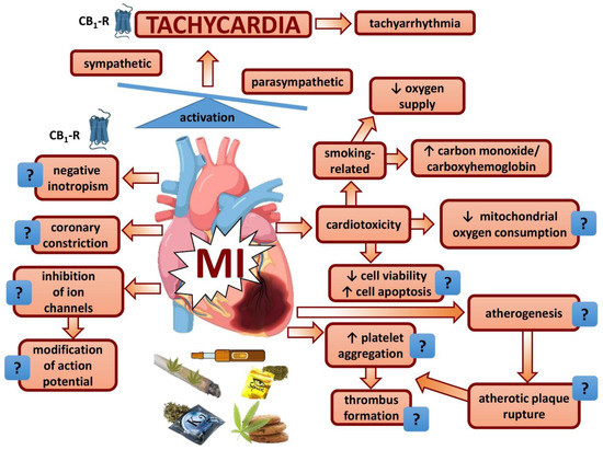 Zuurman et al. [101] clearly showed in their review analyzing 165 articles, which are dedicated to the acute effects of cannabis or THC on the central nervous system (CNS) and HR in healthy volunteers and are based on 318 tests (or test variants), that an increase in HR is the most reliable biomarker to study the effects of cannabis. Tachycardia leading to complex adverse cardiac consequences such as a decrease in cardiac-stroke volume or myocardial oxygen supply–demand imbalance is regarded as a potent predictor of cardiovascular morbidity and mortality [102,103]. In this context, it is of interest that a reduction in heart rate (HR) induced by various drugs has a beneficial effect in patients with MI [103].