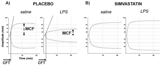 Representative ROTEM graphs showing the effect of LPS vs. saline on the in vitro clot formation in the placebo (A) and simvastatin treatment conditions (B). CFT, clotting formation time (sec); MCF, maximum clot firmness (units). More details on the curves are provided in Table 1.