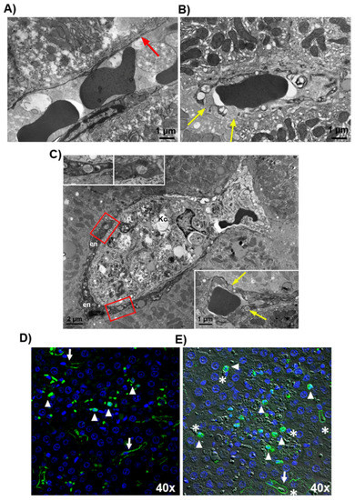 Rats exposed to LPS showed more severe liver damage compared to those exposed to saline, as shown by a greater degree of eosinophilic and necrotic liver cells, which are markers of cellular stress and death, respectively. (Figure 5A–D). The histological grading results are summarized in Supplementary Table S4. Focal necrosis was more relevant in the periportal regions of LPS-exposed rats and associated with immunoreactivity for fibrin, VWF and TM (Figure 5G), thus confirming the involvement of the coagulation system and the endothelium in the pathogenesis of liver damage induced by endotoxemia. The colocalization of VWF with fibrin in clots used as positive controls was confirmed by the merged image (Figure 5H), in which VWF-positive fibrils were also fibrin-positive. Typically, inside the areas of liver damage, the endothelium showed signs of cellular stress such as dense granules inside the cytoplasm and abnormally large fenestrations consistent with the loss of endothelial cells and breaking of the endothelium lining the sinusoids, which were larger than expected (150–175 nm) based on physiologic fenestration (Figure 6A,B) [22]. Furthermore, Transmission Electron Microscopy revealed the presence of Kupffer cells in a tight relationship with injured endothelial cells in sinusoids (Figure 6C), suggesting a role for Kupffer cells in LPS-induced endothelial dysfunction. This observation was confirmed by immunofluorescence analysis. In fact, in those sinusoids where TM was still expressed by endothelial cells, the protein was detected as a continuous immunoreactive line (Figure 6D,E). In contrast, in those areas where immunoreactivity along sinusoids was lost, TM-positive aggregates were observed in DAPI stained cells, suggesting that they were Kupffer cells after the internalization of TM (see arrows and arrowheads in Figure 6D,E).