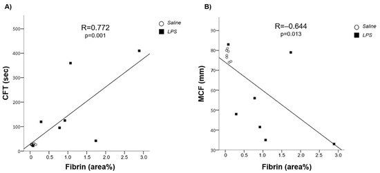 Correlation between fibrin clot formation time (A) and maximum clot firmness (B).