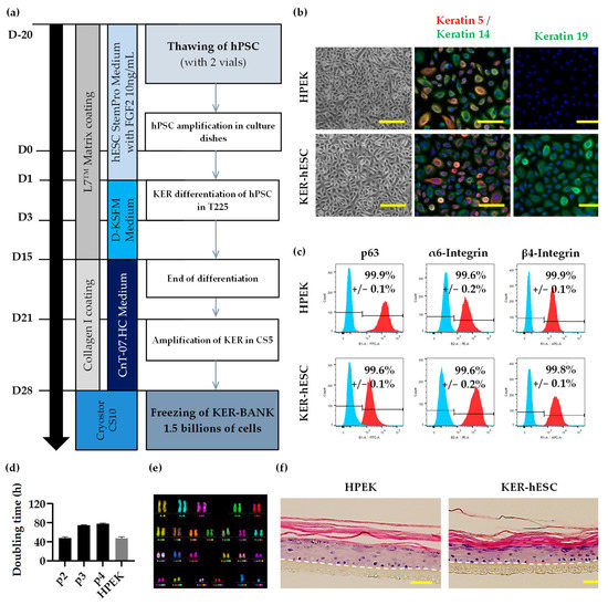 Characterization of a homogeneous and functional population of keratinocytes derived from hESC. (a) Schematic representation of the clinical compatible protocol design for differentiation of hPSC into keratinocytes. (b) Microscopic observation of HPEKp3 and KER-hESCp2 morphology (Scale bars: 200 µm) and immunocytochemistry analysis of keratin 5, keratin 14, and keratin 19 (Scale bars: 100 µm). (c) Flow cytometry analysis of p63, α6-Integrin, and β4-Integrin expression (in red). Staining with isotypic antibody (in blue) was performed as control. (d) Doubling time of KER-hESC from passage 2 (p2) until p4 and HPEKp3. (e) Karyotype analysis of KER-hESC (46:XY) by mFISH staining. (f) Eosin-Hematoxylin staining of epidermal reconstitution on polycarbonate membrane (Scale bars: 100 µm).