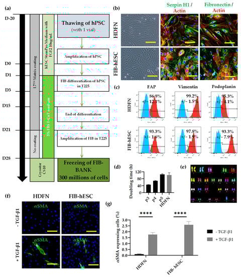 Characterization of a homogeneous and functional population of fibroblasts derived from hESC. (a) Schematic representation of the clinical compatible protocol design for differentiation of hPSC into fibroblasts. (b) Microscopic observation of HDFN and FIB-hESC morphology (Scale bars: 200 µm) and immunocytochemistry analysis of Serpin H1 and Fibronectin (Scale bars: 100 µm). The cell’s shape was observed with actin staining (in red). (c) Flow cytometry analysis of FAP, Vimentin, and Podoplanin (in red). Staining with isotypic antibody (in blue) was performed as control. (d) Doubling time of FIB-hESC from passage 3 (p3) until p5 and HDFNp4. (e) Karyotype analysis by mFISH staining of FIB-ESC (46:XY). (f,g) Immunocytochemistry analysis and associated quantification of αSMA in differentiated HDFN and FIB-hESC after TGF-β1 stimulation (Scale bars: 200 µm). For statistical significance: **** p < 0.001.