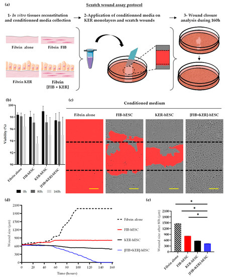 First, the viability of unwounded primary keratinocytes was measured for 160 h to evaluate a potential toxic effect of these conditioned media on the monolayer (Figure 4b). The results showed that under all conditions, there was no major impact on viability after 80 h and 160 h, with more than 92% of living cells in the wells. Next, these conditioned media were applied on scratched keratinocyte monolayers (Figure 4c). The conditioned medium collected from the fibrin alone tissue showed a negative impact on the scratched KER monolayer: the wound was not closed but on the contrary, it had widened and no more cells were visible in the field after 160 h (Figure 4c). With conditioned media from the FIB-hESC alone or KER-hESC alone tissues, wounds were also not closed but cells around the wound were still present (Figure 4c).