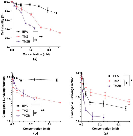Antitumor activity of BPA, TMZ, and TMZB with or without BNCT. (a) HS683 cell viability was measured with a CCK8 assay, where cells were treated with 1.0 μmol/mL of BPA, TMZ, or TMZ-B. (b) Clonogenic surviving fractions of HS683 cells treated with various concentrations of BPA, TMZ, or TMZB without BNCT. (c) Clonogenic surviving fractions of HS683 cells treated with various concentrations of BPA-, TMZ-, or TMZB-based BNCT. The IC50 was calculated using Prism8 software. The statistical comparisons between curves were carried out using the Wilcoxon signed rank test and survival curve. * p < 0.05, ** p < 0.01.