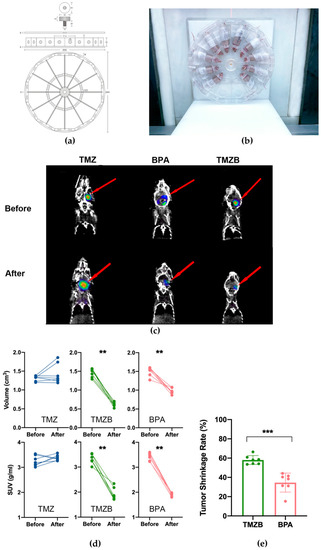 Evaluation of BNCT response of GBM mouse models via PET/CT imaging. (a) Schematic illustration for the mice immobilization mold. (b) Image of mice in the manufactured device for neutron irradiation in BNCT. (c) Representative PET/CT images before and after BNCT treatment (at 31 days after BNCT treatment). (d) Volume and SUV change in GBM tumors in each mouse before and after BNCT treatments with BPA (50 mg 10B/kg in 5% fructose solution), TMZB solution (50 mg 10B/kg), or TMZ at 600 mg/kg. Certain numbers of mice were tested in each treatment group: nTMZ = 7, nTMZB = 8, nBPA = 8. (e) Tumor shrinkage rate after BNCT with TMZB or BPA. Statistical comparisons were carried out with a Mann–Whitney test and a two-way ANOVA. ** p < 0.01, *** p < 0.001.