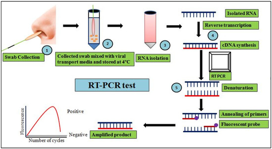 Flow chart of RT-PCR--based detection of SARS-CoV-2 infection: (1) collection of the test sample from anindividual; (2) mixing the collected sample with viral transport media and storageat 4 °C until use; (3) isolation of viral RNAs from the collected sample; (4) synthesis of cDNA from viral RNA by reverse transcription; (5) RT-PCR with specific primers/fluorescent markers demonstrates either positive or negative results for SARS-CoV-2 detection.