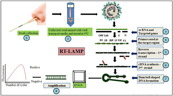 Figure 2. RT-LAMP technique-based detection of SARS-CoV-2 infection: (1) collection ofhuman samples; (2) mixing of the collected sample with viral transport media and storageat 4 °C until use; (3) single-stranded RNA genome of SARS-CoV-2 with the targeted genes; (4) specific primers binding atthe targeted genes; (5) synthesizing the first-strand cDNA by reverse transcription; (6) DNA polymerization for second-strand cDNA synthesis; (7) dumbbell-shaped DNA formation during the process of cDNA synthesis; (8) RT-PCR with specific primers/fluorescent markers demonstrates either positive or negative results for SARS-CoV-2 detection. - Calorimetric interpretationby photometry-based detection of the viral DNA ornaked eye visualization based on magnesium pyrophosphate-mediated precipitation reaction [62].