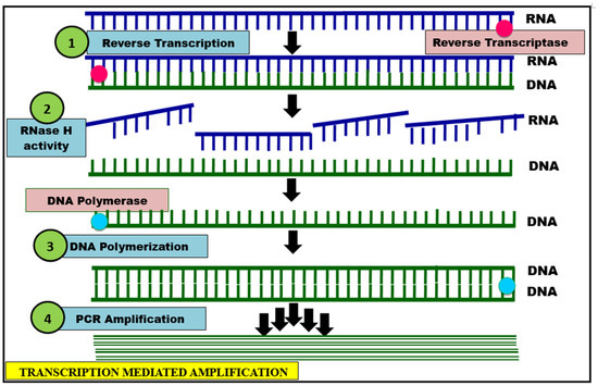 This technique is a modification of isothermal nucleic acid amplification, which is specifically used to diagnose infectious diseases caused by RNA viruses [61]. It is accomplished by the three sequential steps: