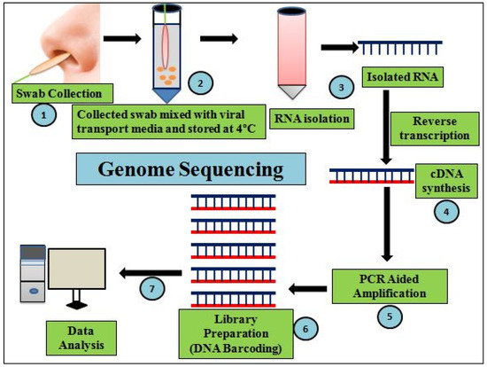 Genome sequencing for detection of SARS-CoV-2 variants: (1) swab/test sample collection from an individual; (2) mixingthe collected sample with viral transport media and storage at 4 °C; (3) isolation of viral RNA from the collected sample; (4) cDNA synthesis from viral RNA by reverse transcription; (5) PCR-aided amplification; (6) computer-aided library preparation and collection of nucleotide databases; (7) further data analysis: RNA/whole-genome sequencing via NGS to identify SARS-CoV-2 variants assist in redesigning novel molecular-based diagnostics therapies to combat COVID-19.