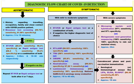 The probable flow chart of diagnostic tests used to rule out COVID-19 infections in asymptomatic and symptomatic persons has been illustrated in Figure 6.