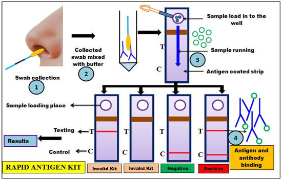 Rapid antigen test (RAT) kit-based detection of SARS-CoV-2 infection: (1) test samples are collected in the form of swabs; (2) mixing the collected swab samples with buffer; (3) loading collected sample into the well of the antigen-coated strip; (4) formation of one band representsa negative test, and two bands represent a positive test for COVID-19 infection.