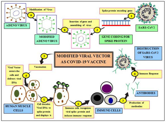 The viral vector vaccination platform uses non-infectious empty viral particles that self-assemble as infectious virions and having the ability to mimic antigenic (coronavirus) sequences. Due to the lack of a viral genome, these vaccines are empty viral particles of delivery systems containing foreign antigenic proteins (SARS-CoV-2) on their surface. These vaccines use the virus as vectors which are chemically destabilized to make them non-infectious in nature. Due to the natural tendency of host cell infection by viruses, viral vector-based vaccines have the highest ability to carry gene transduction [131]. The majority ofhuman cells are easily infected with adenoviral vectors because they have adenovirus cell surface receptors that aid in adenovirus attachment and entry into the cell. Viral vector vaccines are of either non-replicating (inactivation of viral replicating genes) or replication type. Viral vector vaccines (Figure 10) express the antigenic proteins using the protein machinery of the infected cells, which evokes higher intensities of immune responses of both cellular and humoral types [132]. However, possible reversion to a pathogenic type remains a safety concern [133]. Despite this, viral vector-based vaccines are known to be produced rapidly in bulk quantities and need cold-chain requirements during vaccine storage and transportation [41].