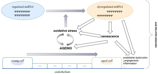 The role of dysregulated miRNAs in the pathophysiology of endothelial cell senescence and ageing, and their contribution to the development of age-related diseases.