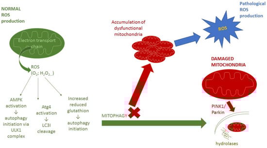 Mitophagy and mitochondrial function. Abbreviations: ROS—reactive oxygen species, O2•− superoxide anion radical, H2O2—hydrogen peroxide, AMPK—AMP-activated protein kinase, ULK1—Unc-51-like autophagy activating kinase, Atg4—AuTophaGy-related protein 4, LC3I—microtubule-associated protein light chain 3-I, PINK1—PTEN-induced kinase ROS are formed in the electron transport chain on the inner membrane of mitochondria. At low levels, ROS are important for normal cell signaling and are also able to positively regulate autophagy through three different mechanisms. At first, activation of AMPK protein kinase via S-glutathionylation of cysteines located in the subunits of AMPK leads to activation of ULK1 complex and subsequent autophagy initiation []. Second mechanism involves oxidation of cystein-81 of Atg4, which leads to the cleavage of LC3I to LC3II and facilitates the formation of autophagolysosomes []. The last one is the release of reduced glutathione, which can initiate autophagy []. These processes contribute to the proper functioning of autophagy/mitophagy and removal of damaged organelles from cells. When the mitophagy process is defective, dysfunctional mitochondria accumulate. The consequence is an increased production of ROS, which can lead to pathological redox signaling and can also disrupt all of these processes.