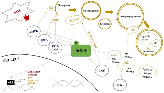 Another mechanisms of both Nrf2 and autophagy regulation involves activities of several protein kinases (Figure 2). Specifically, TGF-β-activated kinase 1 (TAK1), an inflammatory signaling protein kinase, regulates autophagy adaptor p62 to facilitate decreased Keap1 levels, which results in an upregulation of Nrf2 []. c-Jun N-terminal kinases (JNKs) and extracellular signal-regulated kinases (ERKs), members of the mitogen-activated protein kinase (MAPK) family, are another upstream effector involved in autophagy regulation in conditions of increased free radicals production []. JNK can also regulate autophagy via Bcl-2 phosphorylation. This phosphorylation blocks Bcl-2 interaction with Beclin-1 and its consequence is an inhibition of Beclin-1 function []. The activation of the AMPK signaling is another response to oxidative stress. AMPK can stimulate Nrf2-dependent gene expression during oxidative stress through Nrf2 phosphorylation at serine 550 []. It was also found to inhibit mTOR and in such way that it directly induces ULK1 activity to enhance autophagy activation []. Interestingly, Kosztelnik et al. reported that Nrf2 negatively regulates autophagy during chronic oxidative stress. They attributed this effect to the delayed downregulation of the AMPK expression [].