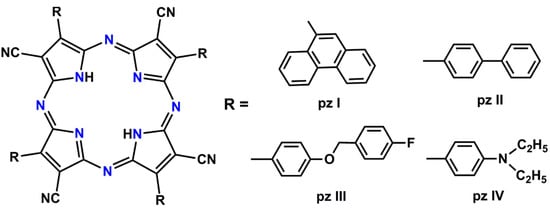 A chemical structure of the synthesized tetracyanotetra(aryl)porphyrazines: pz I, pz II, pz III, and pz IV.