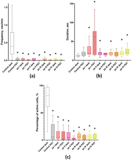 Therefore, considering the significant changes in the functional activity of neuron-glial networks in vitro, the feasibility of the direct application of PDT based on pz I–IV in the therapy of gliomas is highly controversial. Nevertheless, the unique properties of pz I–IV retain a great prospect of their use in PDT cancer therapy. Looking ahead, pz I–IV could be applied in the therapy of other types of tumors differed by cells’ origin and cellular metabolism from glioma and healthy nervous system cells. For instance, we previously showed that pz II and pz IV cause pronounced cytotoxicity against human epidermoid carcinoma A431 cells, whereas photoinduced effects regarding human immortalized keratinocytes HaCaT were significantly lower []. PDT based on pz I and pz III effectively kills fibrosarcoma MCA205 cells through the immunogenic pathway accompanied by the emission from PDT-induced cancer cells of two crucial DAMPs (ATP and HMGB1) with subsequent engulfment by antigen-presenting cells (i.e., dendritic cells, DC) and induction of their activation and maturation in vitro []. Moreover, in the tumor prophylactic vaccination model in vivo, it has been shown that fibrosarcoma MCA205 cells stimulated with pz I-PDT or pz III-PDT served as a potent vaccine-activated adaptive immune response and significantly decreased the tumor growth at the challenge site [].