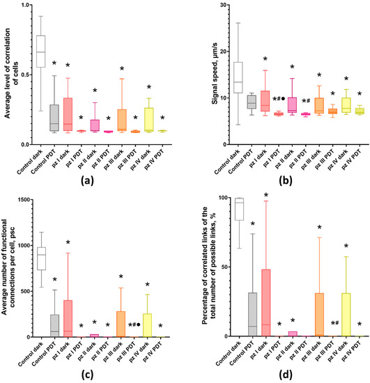 Application of pz I–IV without PDT leads to significant changes in the network characteristics of neuron-glial networks. Against the background of a decrease in the number of working cells and Ca2+ activity profile in all experimental groups (Figure 2), there is a decrease in signal speed propagation between cells and the average level of correlation and number of functional connections per cell (Figure 3).