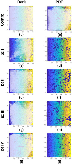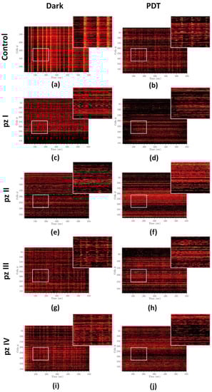 Representative raster diagrams of spontaneous calcium activity of primary hippocampal cultures the next day after PDT. The X-axis represents the time of recording; the Y-axis represents the number of active cells, respectively. The lighter the point, the more intense the fluorescence. Treatments of the following: (a) control dark, (b) control PDT, (c) pz I control, (d) pz I PDT, (e) pz II control, (f) pz II PDT, (g) pz III control, (h) pz III PDT, (i) pz IV control, and (j) pz IV PDT.