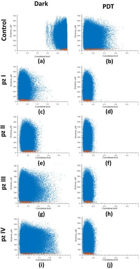 Next, we analyzed the relation between the level of correlation of Ca2+ oscillations on the distance between cells (Figure 5), which showed a high level of correlation in the normal state (“Control dark” group). Most of the points reflecting the relationship between a pair of cells are in the correlation range from 0.8 to 1 (Figure 5a). PDT led to a significant decrease in the level of correlation between cells (Figure 5b). In the “Control PDT” group, the point cloud was shifted to the to the beginning of coordinates, and the correlation level was in the range from 0 to 0.5. A decrease in the level of correlation was also noted in the groups of cultures with application of pz I–IV without irradiation. After photoactivation of all studied photosensitizers (pz I–IV), the point cloud was concentrated in the range from 0 to 0.2, which is considered to be a lack of correlation (Figure 5d,f,h,j).