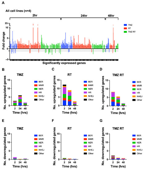 Accumulated frequency and distribution of DEGs across four patient-derived glioblastoma cell lines (FPW1, HW1, SB2b and MN1) in response to treatment. Cell lines were treated with RT (2Gy) and/or TMZ (35µM) before being harvested for RNA extraction at 2, 24 and 48 h after treatment. Quantitative PCR using a Custom TaqMan array card was undertaken to assess mRNA expression of 84 DDR genes. (A) Fold changes (±SEM) represent the sum total of DEGs across all cell lines, treatments (TMZ- blue; RT—red; TMZ + RT—green), and time points. Positive fold-changes (>1) represent upregulated genes and negative fold-changes (<−1) represent downregulated genes, while the area between 1 and −1 represents baseline expression. To view genes and their fold-changes in order of (A), see Table S5. (B–G) The average numbers of upregulated or downregulated genes across all cell lines for TMZ- (B,E), RT- (C,F) and TMZ + RT- (D,G) treated cells are graphically shown and represent the proportion of pathways that the DDR genes belong to at given time points after treatment. DDR pathways for each gene are depicted in Table S2. BER—blue; MMR—red; NER—green; HR—purple; NHEJ—orange; other—black.