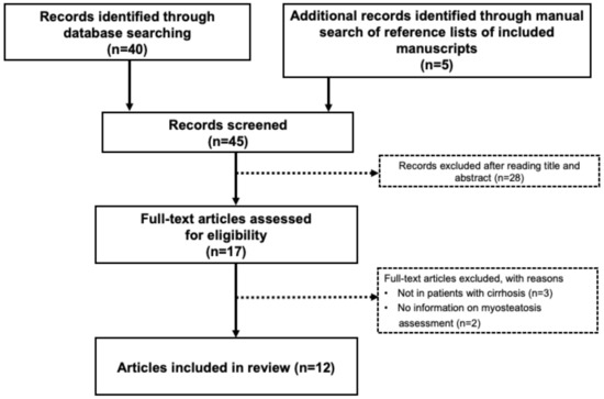 The preliminary search yielded 45 potentially relevant articles. After screening titles and abstracts, 28 papers were excluded, and therefore, 17 full-text articles were reviewed. Of those 17 articles, five were excluded because they did not include patients with cirrhosis or because no explanation for myosteatosis determination was provided. Figure 1 presents a detailed flow chart of the selection of the 12 studies included in this review. Study eligibility was assessed independently by M.E. and A.M.L., and any inconsistencies were resolved by a consensus of the reviewers. Relevant articles are discussed below.