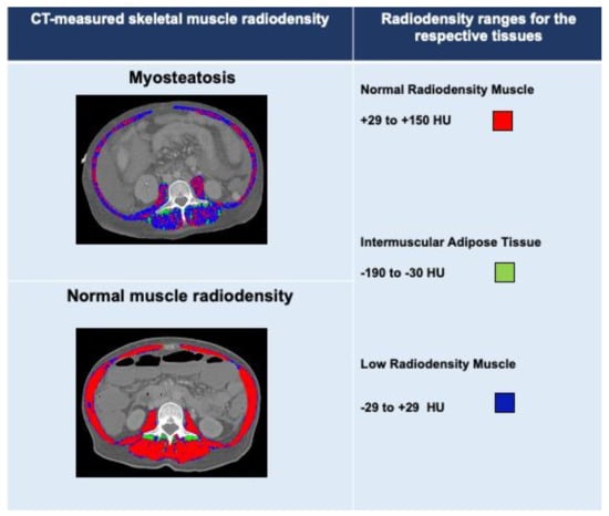 Myosteatosis has also been defined based on IMAT-normalized radiodensity or cross-sectional areas [24,25]. CT radiodensity of the multifidus muscles (HU) was divided by the radiodensity of subcutaneous adipose tissue to determine IMAT. L3-IMAT values >−0.44 in male and >−0.37 in female patients with cirrhosis have been used as cutoffs to delineate myosteatosis [24]. To determine IMAT, predefined radiodensity ranges of −190 to −30 HU [26] were applied to identify the cross-sectional areas of IMAT within the L3 muscle areas [25].