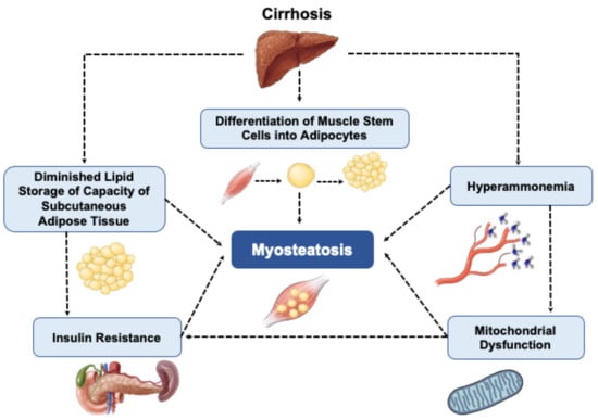 Hyperammonemia, insulin resistance, mitochondrial dysfunction, diminished lipid storage capacity of subcutaneous adipose tissue and age-related differentiation of muscle stem cells into adipocytes have been also suggested as potential mechanisms contributing to myosteatosis.