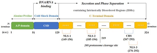 YB-1 is a 324-amino acid protein with a predicted molecular weight of 35.9 KDa. YB-1 is a transcription and translation factor with multiple functions in the expression of various proteins. It consists of a highly conserved nucleic acid binding motif called CSD, an alanine/proline-rich N-terminal, and a C-terminal charged zipper characterized by alternating stretches of positively and negatively charged amino acids [18]. The protein domain structure of human YB-1 is shown in Figure 1.
