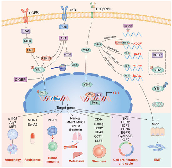 It is well known that activation mutations of the notorious signaling pathways PI3K/AKT/mTOR and Ras/MEK/ERK drive cell proliferation, migration, survival and drug resistance in a variety of cancers. The regulation of YB-1 involving these pathways is widely reported (Figure 2).