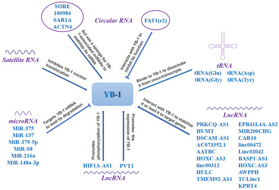 YB-1 is a well-known RBP. Recently, a number of noncoding RNAs, particularly lncRNAs and miRNAs, were reported to regulate YB-1 and tumorigenesis (Figure 3).