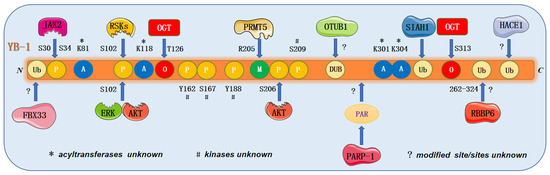 The YB-1 protein undergoes multiple types of post-translational modification, including phosphorylation, ubiquitination, and acetylation. These modifications regulate the activity of the YB-1 protein and play important roles in tumorigenesis, metastasis, and multidrug resistance (Figure 4).