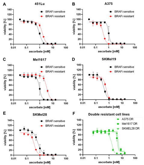 To test the effects of ascorbate on BRAFi-sensitive and resistant cell lines, the viability was measured in five different cell lines with their respective BRAFi (vemurafenib) sensitive and BRAFi resistant variants. The cell lines 451Lu S, 451Lu R, A375 S, A375 R, Mel1617 S, Mel1617 R, SkMel19 S, SkMel19 R, SkMel28 S, and SkMel28 R were used, carrying the BRAFV600E mutation, respectively. The best responses upon ascorbate treatment could be observed in the cell lines A375 R (Figure 2B, red curve), SkMel19 S (Figure 2D, black curve), and SkMel28 R (Figure 2E, red curve). The concentration of 1 mM ascorbate induced almost 100% cell death in these cell lines, and the corresponding IC50 values were the lowest (0.38 mM, 0.39 mM, and 0.34 mM). The lowest treatment response was observed in the cell line Mel1617 R (Figure 2C, red curve). One hundred percent cell death was only detectable when the cells were treated with 8 mM ascorbate and the highest IC50 (3.40 mM) was calculated. The other cell lines showed 100% cell death at about 2 mM (451Lu S (Figure 2A, black curve)), A375 S (Figure 2B, black curve), Mel1617 S (Figure 2C, black curve), and SkMel19 R (Figure 2D, red curve) or 4 mM (451Lu R (Figure 2A, red curve)) and SkMel28 S (Figure 2E, black curve) of ascorbate. IC50 values ranged from 0.59 mM to 1.6 mM. Different effects could be observed when comparing the IC50 values of the sensitive cells to their resistant derivates. A375 R and SkMel28 R tended to be more sensitive to ascorbate treatment when compared with the BRAFi sensitive parental cells. Contrary, 451Lu S, Mel1617 S, and SkMel19 S cells seemed to be more sensitive to ascorbate treatment than their vemurafenib-resistant derivates. The highest difference was detected in Mel1617. There, the IC50 value of Mel1617 R was 3.5× higher than the IC50 of Mel1617 S. However, all melanoma cell lines could be completely killed in the pharmacologically achievable range between 1–10 mM ascorbate. In order to show the relevance for ascorbate treatment also for patients that developed resistance against BRAFi + MEKi, we treated three double resistant (DR) cell lines with increasing concentrations of ascorbate. The IC50 value of A375 DR was the lowest with 1.49 mM, Mel1617 DR showed an IC50 of 4.27 mM and SKMel28 DR showed the highest IC50 value with 5.13 mM.