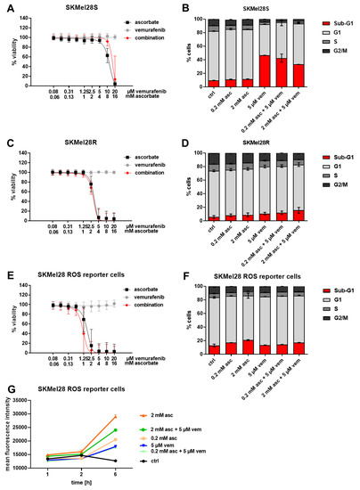 Effects of ascorbate and vemurafenib on viability, cell cycle distribution, and ROS production of melanoma cells. (A) SKMel28 S, (C) SKMel28 R, and (E) SKMel28 ROS reporter cells were treated with ascorbate, vemurafenib, and their combination. Depicted is the viability of treated cells compared to the untreated control. Shown are the mean values with standard deviations of three independent experiments, each measured in quadruplicates and normalized to the untreated control. (B) SKMel28 S, (D) SKMel28 R and (F) SKMel28 ROS reporter cells were treated with ascorbate, vemurafenib, and their combination. The cell cycle after PI staining was analyzed by flow cytometry. Shown are the mean values of each cell cycle fraction with standard deviations of three independent experiments, each measured in triplicates. (G) Flow cytometry measurement of the ratio Pacific Orange 405 nM/Alexa Fluor 488 nM, which resembles the amount of produced H2O2. SKMel28 H2O2 reporter cells were treated with ascorbate, vemurafenib, and their combination. Shown are the mean values with standard deviations of three independent experiments, each measured in quadruplicates and normalized to the untreated control.