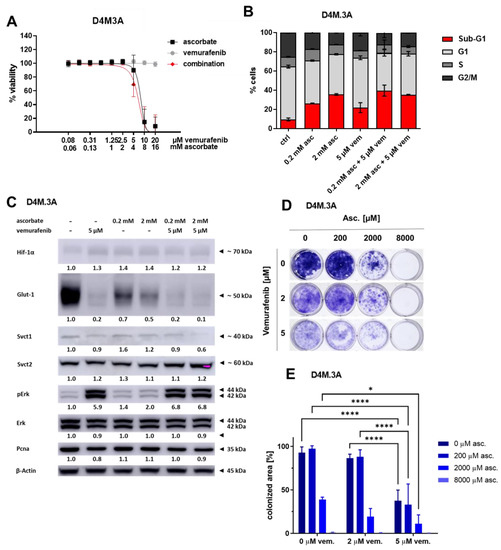 Effects of ascorbate and vemurafenib on viability, cell cycle, protein expression and long-term growth of BRAF mutated mouse melanoma cells D4M.3A. (A) D4M.3A cells were treated with ascorbate, vemurafenib, and their combination. Viability of treated cells was measured and compared to the untreated control. Shown are the mean values with standard deviations of three independent experiments, each measured in quadruplicates and normalized to the untreated control. (B) D4M.3A cells were treated with ascorbate, vemurafenib, and their combination. After propidium iodide staining, the cell cycle was measured by flow cytometry. Shown are the mean values of each cell cycle fraction with standard deviations of three independent experiments, each measured in triplicates. (C) Protein expression levels of Hif-1α, Glut-1, Svct1, Svct2, phospho-Erk1/2 (pErk), Erk1/2 (Erk), Pcna, and β-Actin as control were analyzed by Western Blot in the cell line D4M.3A after treatment with ascorbate, vemurafenib, and their combination. Shown is one representative experiment of three. (D) For a colony formation assay D4M.3A cells were treated with ascorbate, vemurafenib and the combination. The growth area of the formed colonies was measured and normalized to the surface area of the culture dish (100%). (E) Quantification of the colony formation assay shown in (D). D4M.3A cells were treated with ascorbate, vemurafenib and the combination. *: p ≤ 0.05; ****: p ≤ 0.0001.