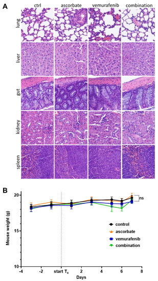 Treatment effects on mouse organs and weight and immunohistochemical analysis of mouse tumors. (A) H&E staining of mouse organs (lung, liver, gut, kidney, and spleen) of mice treated with ascorbate (3 g/kg i.p., daily), vemurafenib (30 mg/kg, five times weekly) and their combination. (B) Weight progress curves of mice during treatment with ascorbate (3 g/kg i.p. daily), vemurafenib (30 mg/kg i.p., five times weekly), and their combination. (C) H&E staining of tumors from mice treated with ascorbate (3 g/kg i.p., daily), vemurafenib (30 mg/kg i.p., five times weekly), and their combination. (D) Immunohistochemical staining for Pcna, Hif-1α, and Glut-1 of tumors from mice treated with ascorbate (3 g/kg i.p., daily), vemurafenib (30 mg/kg i.p., five times weekly), and their combination. (E) Immunofluorescent TUNEL staining of tumors from mice treated with ascorbate (3 g/kg i.p. daily), vemurafenib (30 mg/kg i.p., five times weekly), and their combination. Representative pictures are shown in a magnification of 200-fold. ns: p > 0.05.