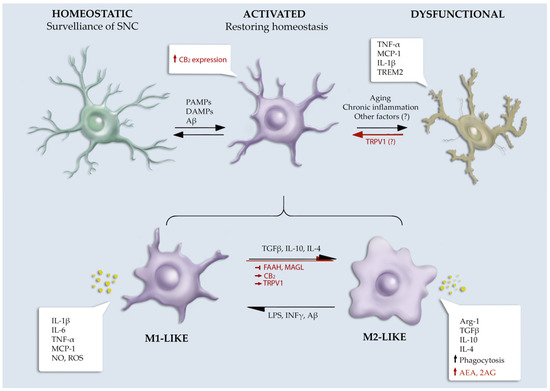 The ECS has a pivotal role in brain inflammation by regulating microglial biology in terms of proliferation, migration, phagocytosis, and the production of pro- and anti-inflammatory mediators [8] (Figure 1).