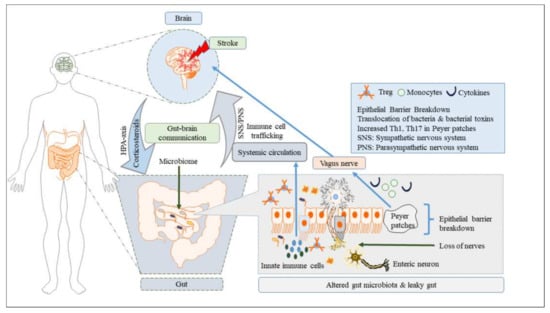 During stroke-induced gut dysbiosis, reinforcement of chronic inflammation by the excessive recruitment or infiltration of peripheral immune cells (Th1 cells, Th17 cells, and monocytes from the Peyer’s patches to the infarct region), gut-derived toxic metabolites, and bacterial translocation suppresses the polarization of anti-inflammatory Treg cells [123]. Notably, dendritic cells migrate to mesenteric lymph nodes to drive differentiation of T cells into Treg cells under the influence of pro-inflammatory microbiota [44]. Reduced migration of Treg cells to the lamina propria also promotes γδ T-cell differentiation. Pro-inflammatory Th17, Th1, and γδ T-cells originating from the lamina propria of the small intestine migrate to the meninges, accelerate inflammatory damage, and increase the infarct size [78,124]. Additionally, brain-injury-derived DAMPs and the cytokine storm from activated microglia with increased amounts of IL-6, TNF-α, and IFN-γ stimulate the vagus nerve, which, in return, causes gut dysmotility, dysbiosis, increased permeability, intestinal injury, and sepsis [118].